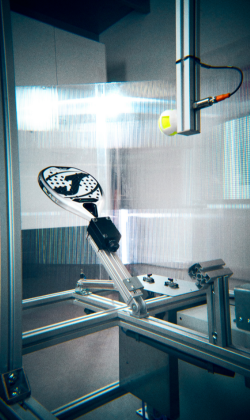 ● Potencia y salida de bola. Para este análisis, la pala se coloca sobre un sistema actuador que, mediante neumática, ejecuta golpes controlados sobre la bola, permitiendo evaluar el nivel de impacto. La salida de la bola mide la velocidad con la que esta se proyecta tras el golpe en condiciones controladas.